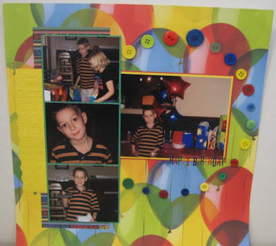 I created this first layout from pictures of my son's 9th birthday. I embossed the yellow cardstock with the happy birthday cuttlebug folder. I added the red, green, blue and yellow buttons on the curve which made it go perfectly for a challenge in one of my Yahoo groups. We are doing a game virtual crop and this challenge was Twister! Create a layout with red, green, blue and yellow circles! Truly I didn't even mean to follow it...I just realized it after the fact! LOL. I have noticed I'm doing a lot of embellies on a curve lately. Bling on Kate's layouts and buttons or brads on Nick's.